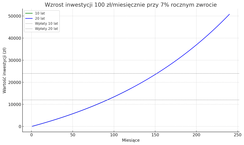 📊 [Prosty wykres: wzrost inwestycji 100 zł przez 10 i 20 lat]